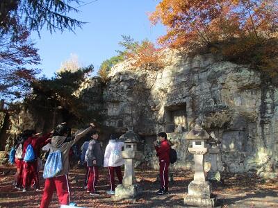 6年生の理科「大地のつくり」で地層を探しに行きました。実際に岩谷観音の地層を見て「層になっている」と驚きと発見がありました。