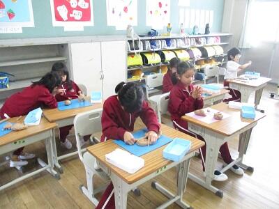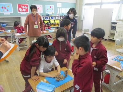 1・2年生は図画工作の時間、粘土を使って作品を作りました。お互いの作品を見て感想を伝え合うことができたいました。
