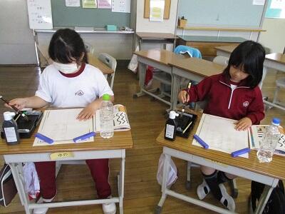初めての毛筆学習です。よい姿勢、筆の持ち方を学習しました。最後にちょっぴり水で書いてみました。