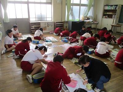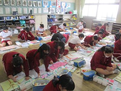 図画工作科の時間に「わたしの大切な風景」で風景画を描いている様子です。