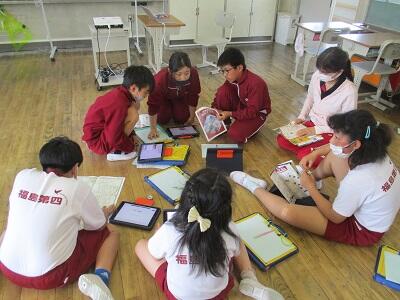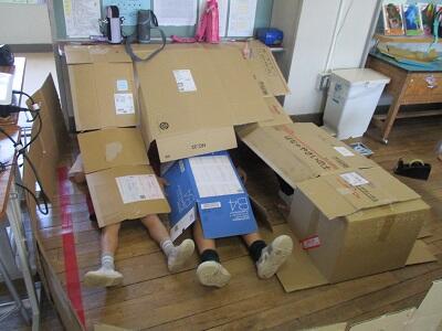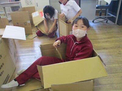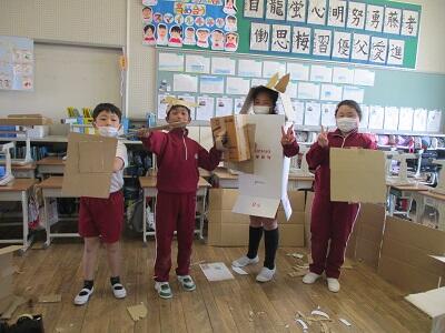 4年生の図画工作の時間では、いつも過ごしている教室を段ボールを使って、もっと心地よい場所にしました。寝ころべるようにしたり、身に着けられるようにしたり様々な工夫をしていました。秘密基地みたいで楽しそうですね。