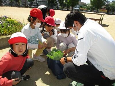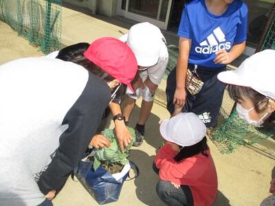 3年生の理科の学習で、キャベツの葉に産み付けたモンシロチョウやアゲハチョウの卵をみんなで観察している様子です。