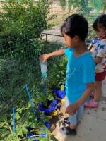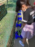 2021年5月29日 10時34分土曜授業。登校すると1,2年生は、教室の外で栽培している植物に水やりです。1年生は、アサガオ。2年生は、ミニトマト、オクラ、シソ、ピーマンなどの野菜です。