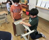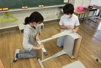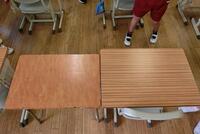 昨年度の6年生に続いて、1~5年生の机・いすが新しくなりました。昨日搬入され、5・6年生に手伝ってもらって各学級に運び入れ、本日から早速使用しました。これまでの机より縦・横それぞれ約5㎝大きくなり、机・ノートのほかにタブレットも置きやすくなりました。