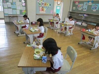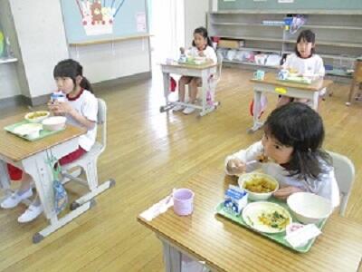 1年生は入学してから、初めての給食でした。献立はカレーライスでした。とっても美味しそうに食べていました。