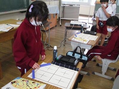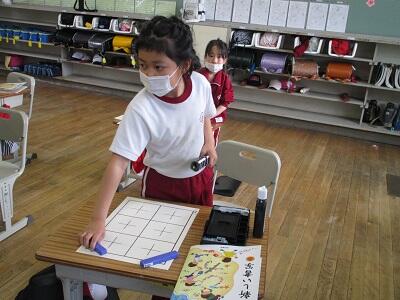 3年生は初めての習字の時間でした。毛筆を使う学習が初めてだったので、使い方や学習の進め方を確認しました。