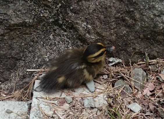 母ガモが心配そうに見守っているものの、飛べないため、これからがとても心配です。