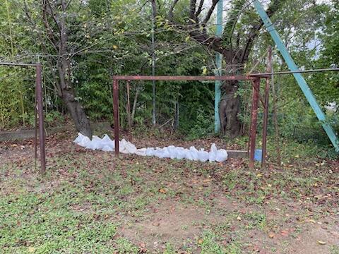 「枝払い」だけでなく、グランドの一角から下の住宅に流れ出る雨水等を防ぐ土嚢の設置までしていただきました。