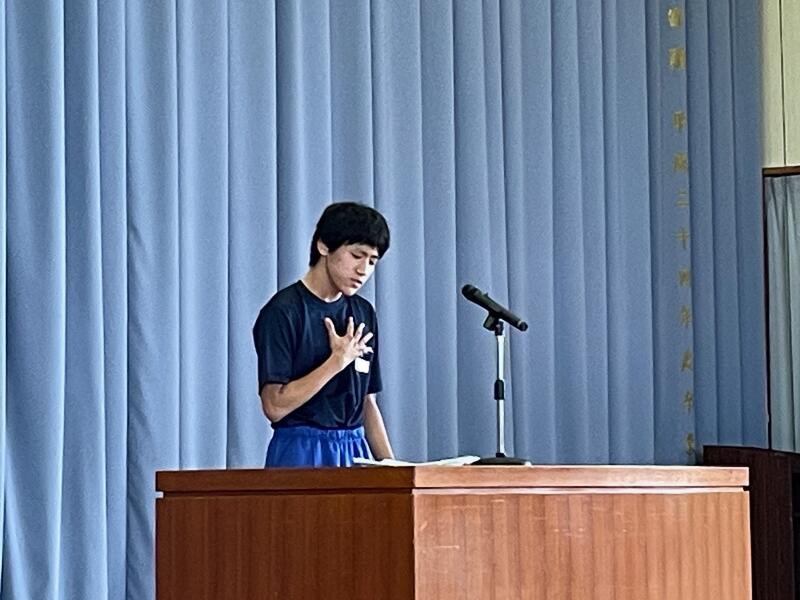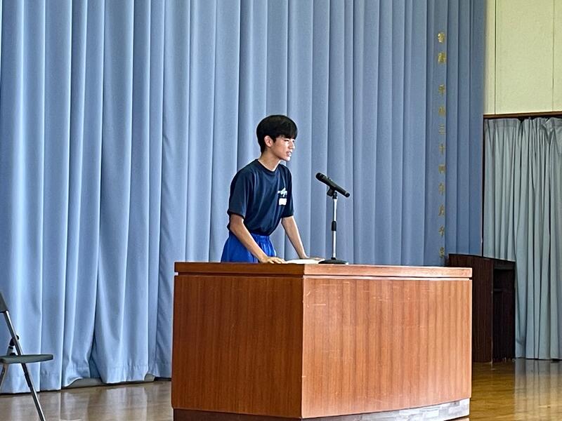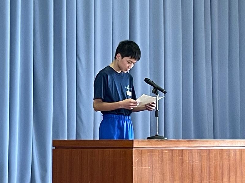 全校集会では、来週の英語弁論大会に出場する2名の生徒の発表がありました。