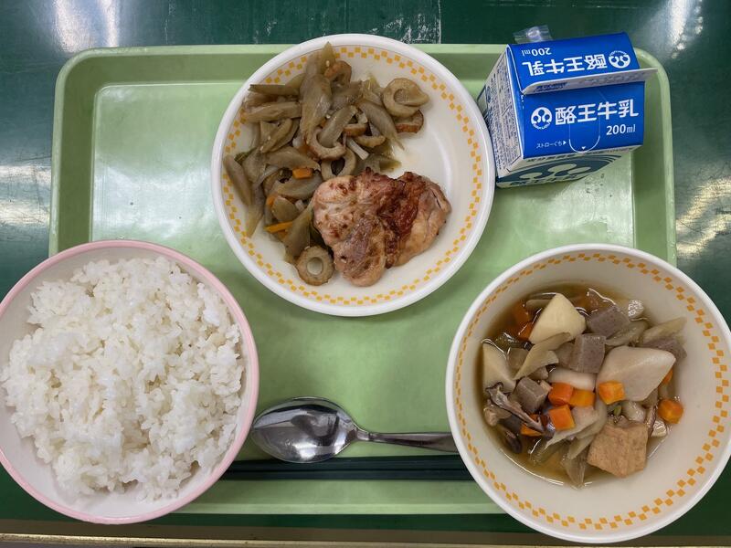カルシウムご飯 牛乳 鶏の照り焼き 五目きんぴら ざくざく汁