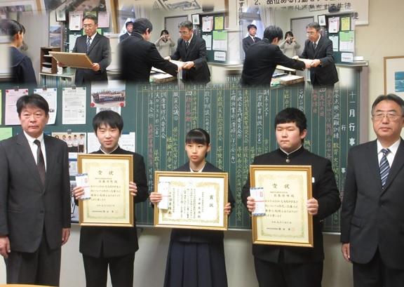 11月27日(水)の16時から校長室にて、「税についての作文」コンクールの表彰式を行いました。福島県県北地方振興局長の熊田様はじめ、県税部主幹の三浦様、主事の白井様が来校し、本校生徒3名に表彰状と副賞が授与されました。おめでとうございます。 ○ 東北地区納税貯蓄組合連合会会長賞 法井 美海さん