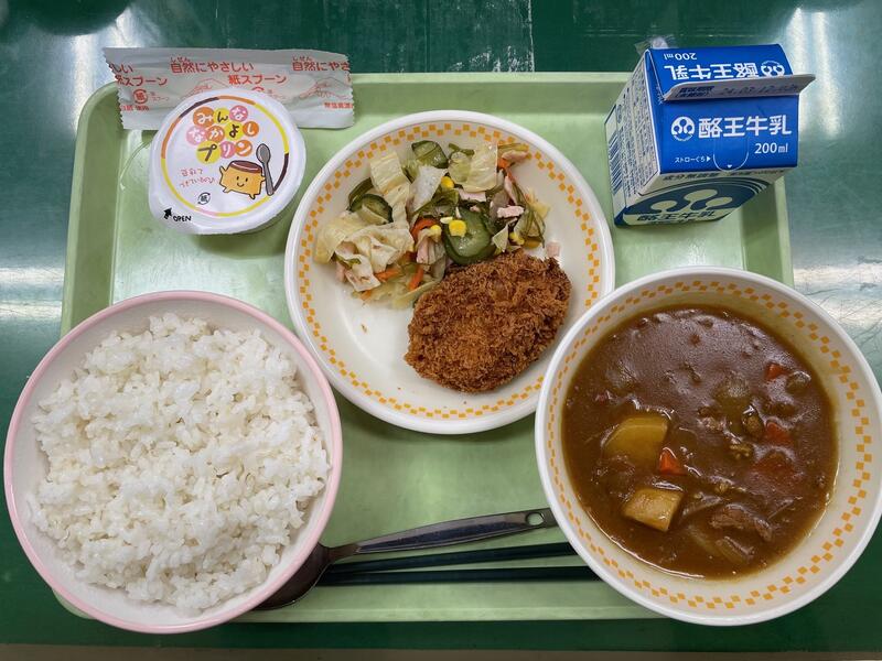 麦ご飯 牛乳 ひとくちヒレカツ りっちゃんサラダ ポークカレー 豆乳プリン