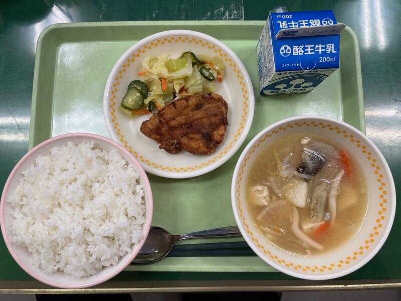 カルシウムご飯 牛乳 鶏のから揚げ アーモンドとごまのサラダ 豚汁