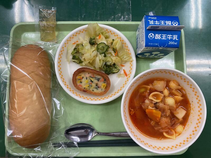 コッペパン リンゴジャム 牛乳 ポテトカップグラタン グリーンサラダ ミネストローネ