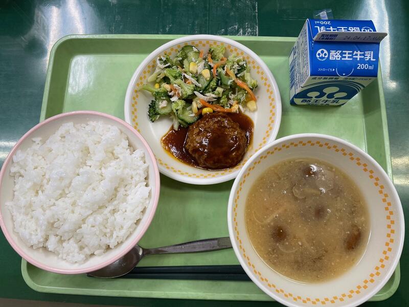 ご飯 牛乳 デミハンバーグ コーンとブロッコリーのサラダ なめこ汁