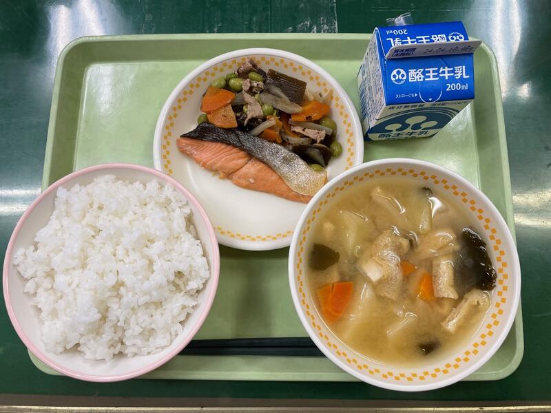 ご飯 牛乳 鮭の塩焼き 五目豆 わかめの味噌汁