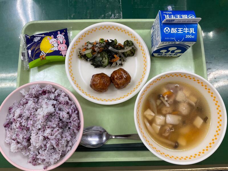 ゆかりご飯 牛乳 うずらの卵スコッチエッグ 大根と海苔のサラダ 月見汁 月見団子
