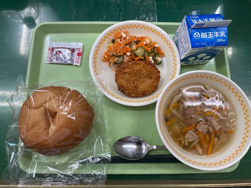 切り目入り丸パン 牛乳 伊達鶏コロッケ パックソース しりしり風サラダ キノコ入りコンソメスープ