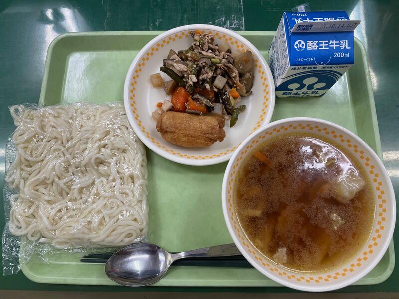 ソフト麺、牛乳 稲荷ずし 煮しめ 五目うどんかけ汁