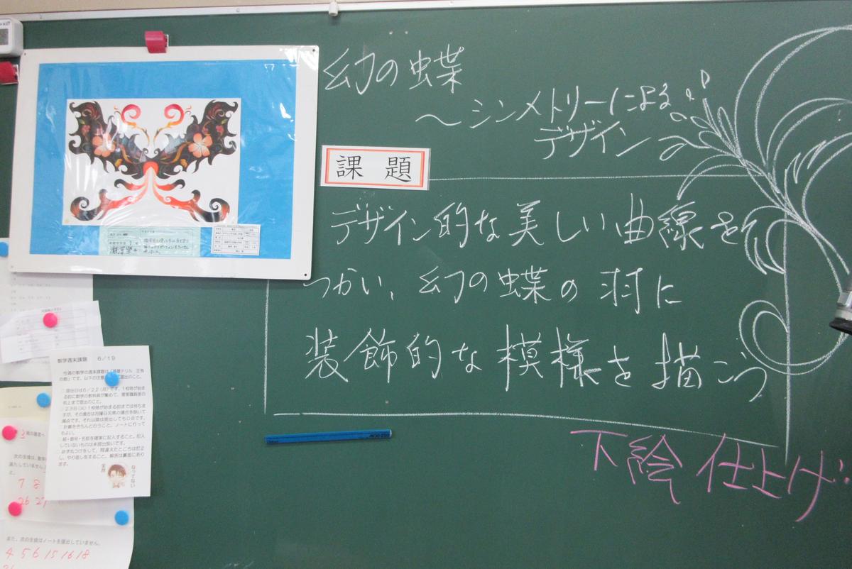 1学年美術で「色彩の基礎」として、蝶のデザインをシンメトリーで図柄を描き、彩色をしていくという学習を進めています。また、3学年では「15才の自画像」として、自分の内面を見つめて、部分スケッチから構成、下絵と進めていきます。作品のできあがりが楽しみです。