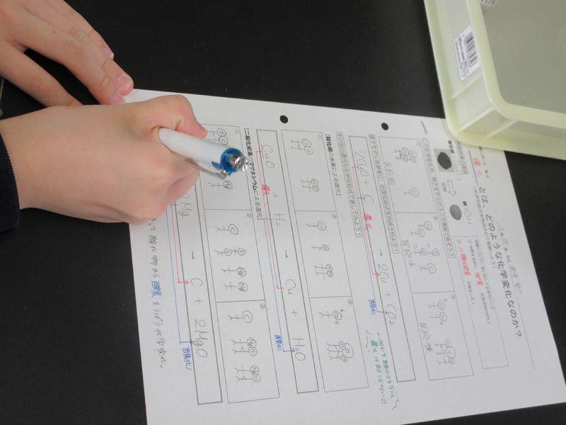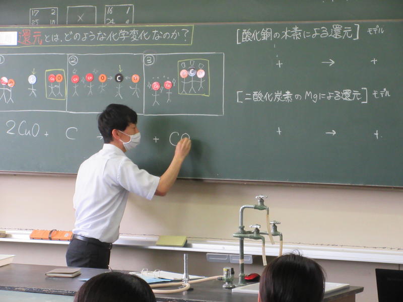 2020年6月24日 13時15分校内研究授業第1回目が行われました。渡辺俊介教諭による2学年の理科「化学変化と原子・分子 第3章 酸素がかかわる化学変化」です。モデルや図を用いて考えを深められるように工夫しました。授業の中では、大型テレビでPowerPointによるスライドおよび実験動画をみせて、わかりやすく工夫していました。また、説明の中で「もののけ姫の中で「たたら場」が出てきて、砂鉄から鉄を取り出す作業をしていたんだ。砂鉄(酸化された鉄)を掘り出すために山を削り、精錬するために木(C)を切り出し、どんどん山を削ったんだね。だから、自然環境が破壊されて、山の動物たちの怒りをかうことになったんだ。まさに還元だよね。」と説明していました。