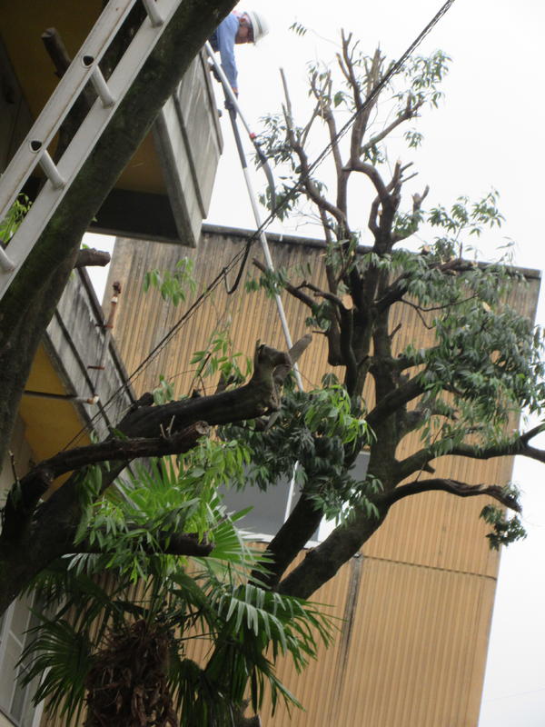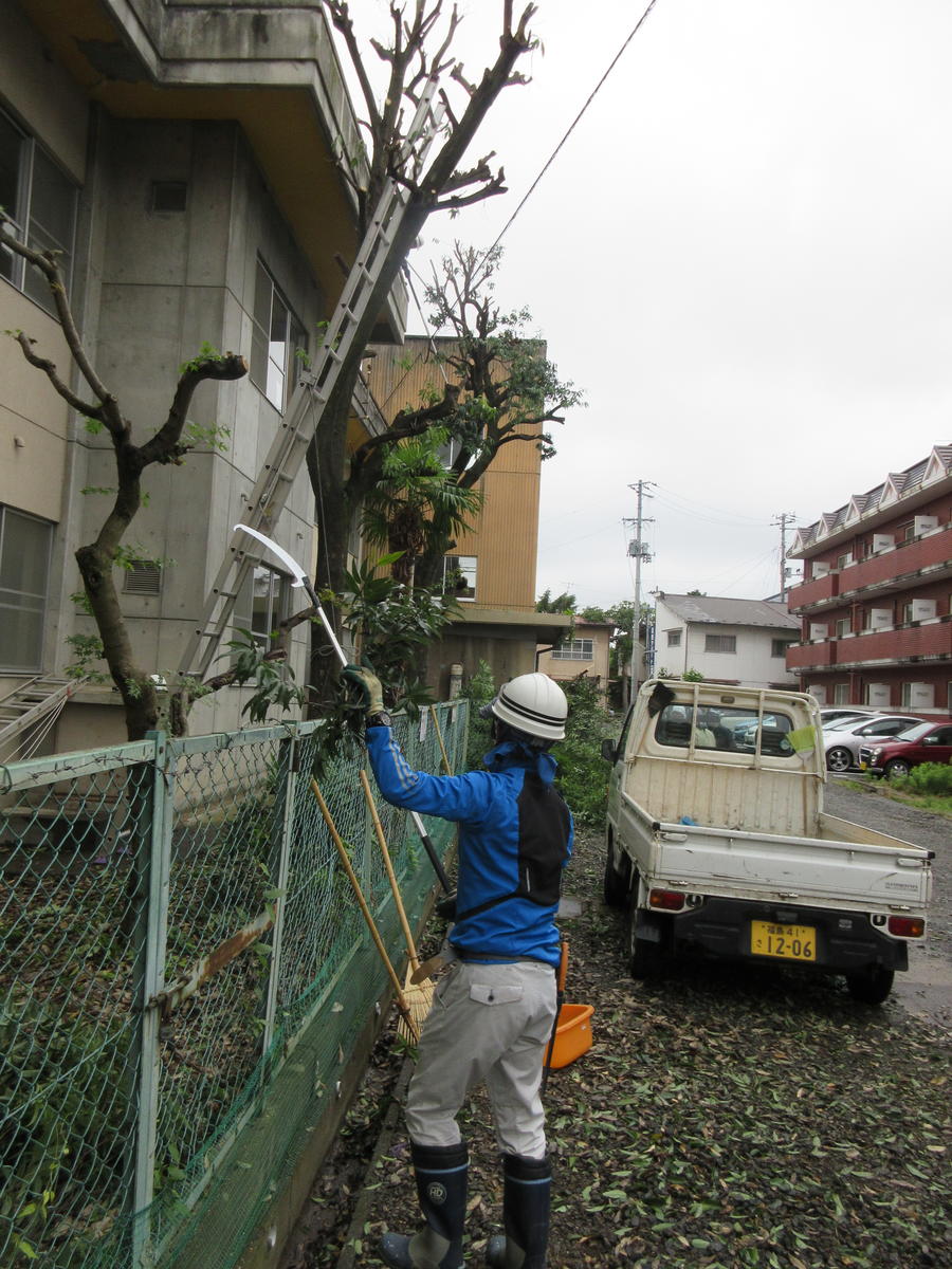 2020年6月25日 13時20分技能主査の方々7名による共同作業が本校で行われました。2回の北側廊下を暗くふさいでいた高い樹木を、葉や枝を下ろしてさっぱりとしていただきました。良い環境の中で学習でき、感謝です。