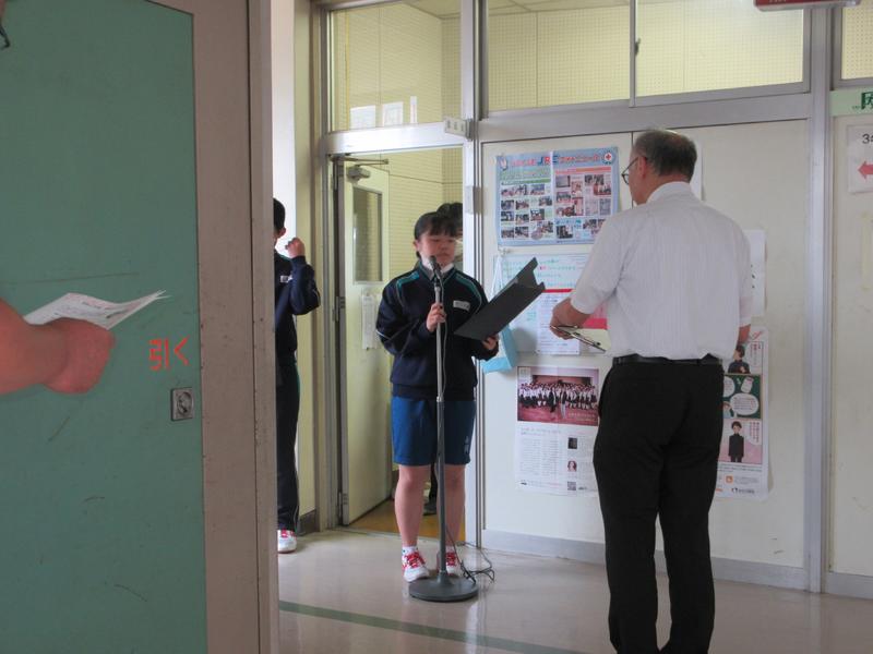 1つ目は、挨拶についてです。3年生のあいさつは大変素晴らしい。挨拶の「挨」の字には「ひらく」の意味、「拶」には「せまる」の意味がある。自ら進んで挨拶をするということは「自分は敵ではない」ということを示すもので「自ら心を開いて相手に迫る」ということである。ぜひ、「相手を見て、いい声で、爽やかに、常に自分から」行ってほしい。2つ目は、安全安心に注意して生活してほしいということです。やれることは、今やることが大切である。後回しにせずにすぐにやる。いざ、危険なことがあってもすぐに対処することができる。危険なことを上手に回避して、リスクを減らす努力が必要である。今週は定期テストがあるが、自分をうまくコントロールしてテストに臨んでほしい。