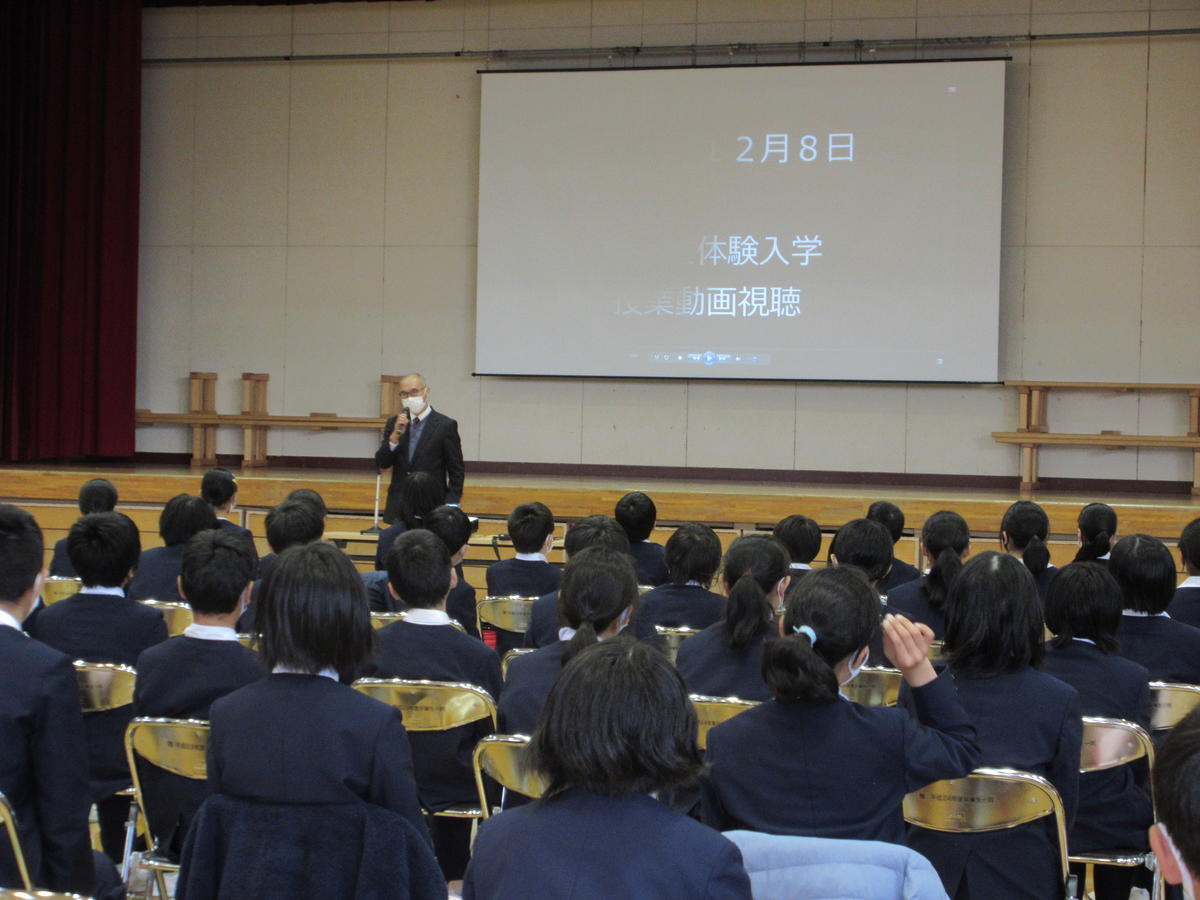三河台小学校や吉井田小学校などから、約120名の小学校6年生を招いて新入生体験入学が行われました。中学校での授業や部活動の様子をビデオで収録したものを見たり、部活動の様子を直接見たりしました。