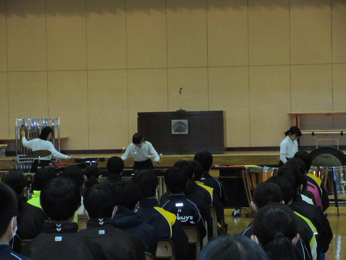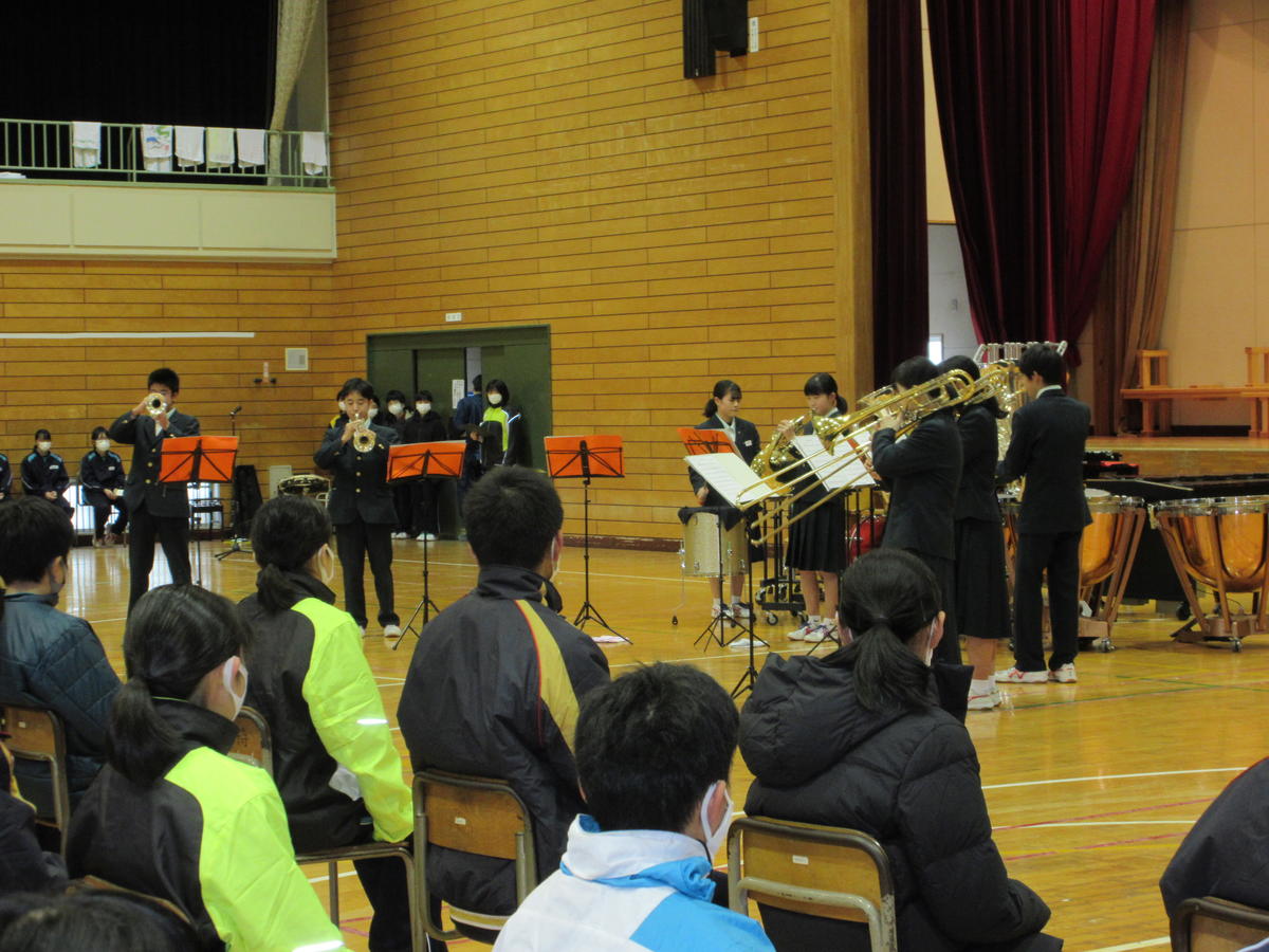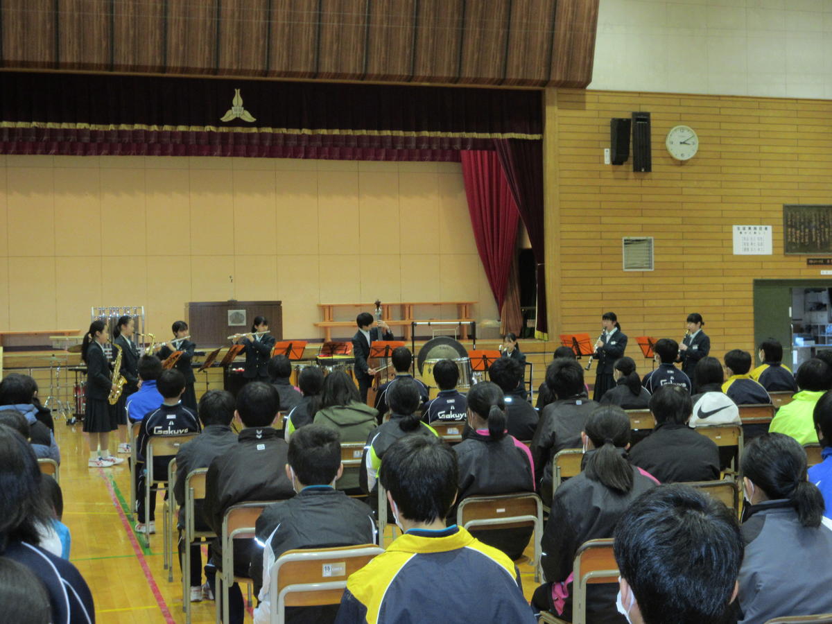 今週末に行われる県北地区吹奏楽アンサンブルの練習曲を全校生の前で発表しました。ちょっと緊張気味な様子でしたが、堂々と大変立派な発表で、当日の演奏が楽しみになりました。