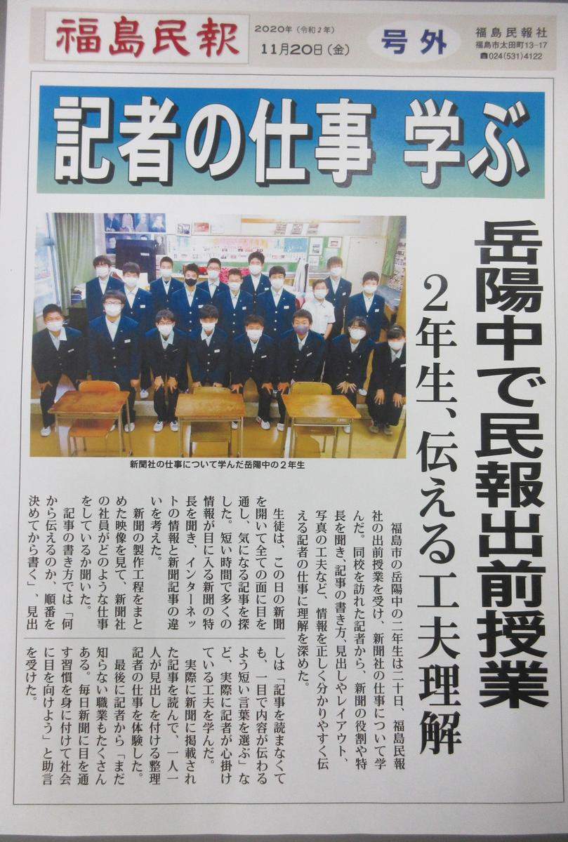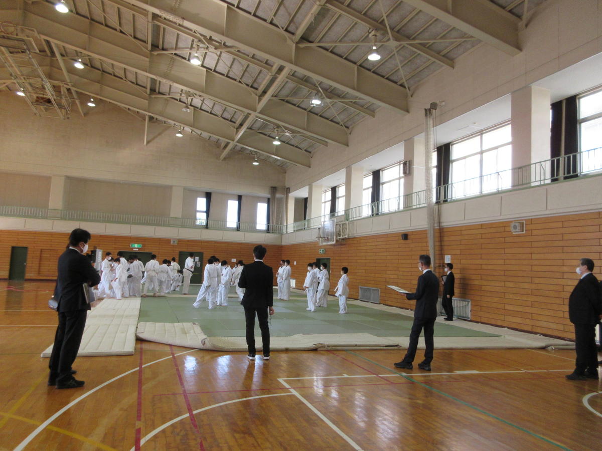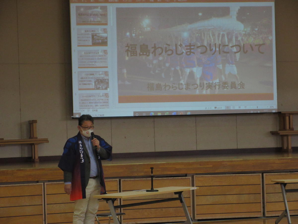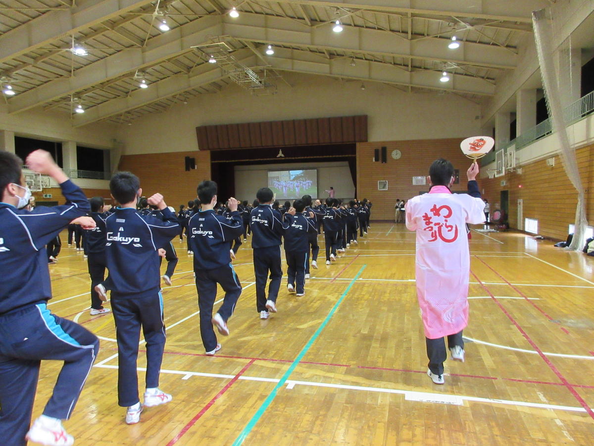 2020年12月7日 16時21分福島市商工会議所の方々16名に来校いただき、新わらじおどりの講習会が行われました。本校の1学年生徒全員を対象に体育館で指導いただきました。太鼓とお囃子のはいった新しい曲に、新しい踊りで生徒達も楽しそうに活動していました。