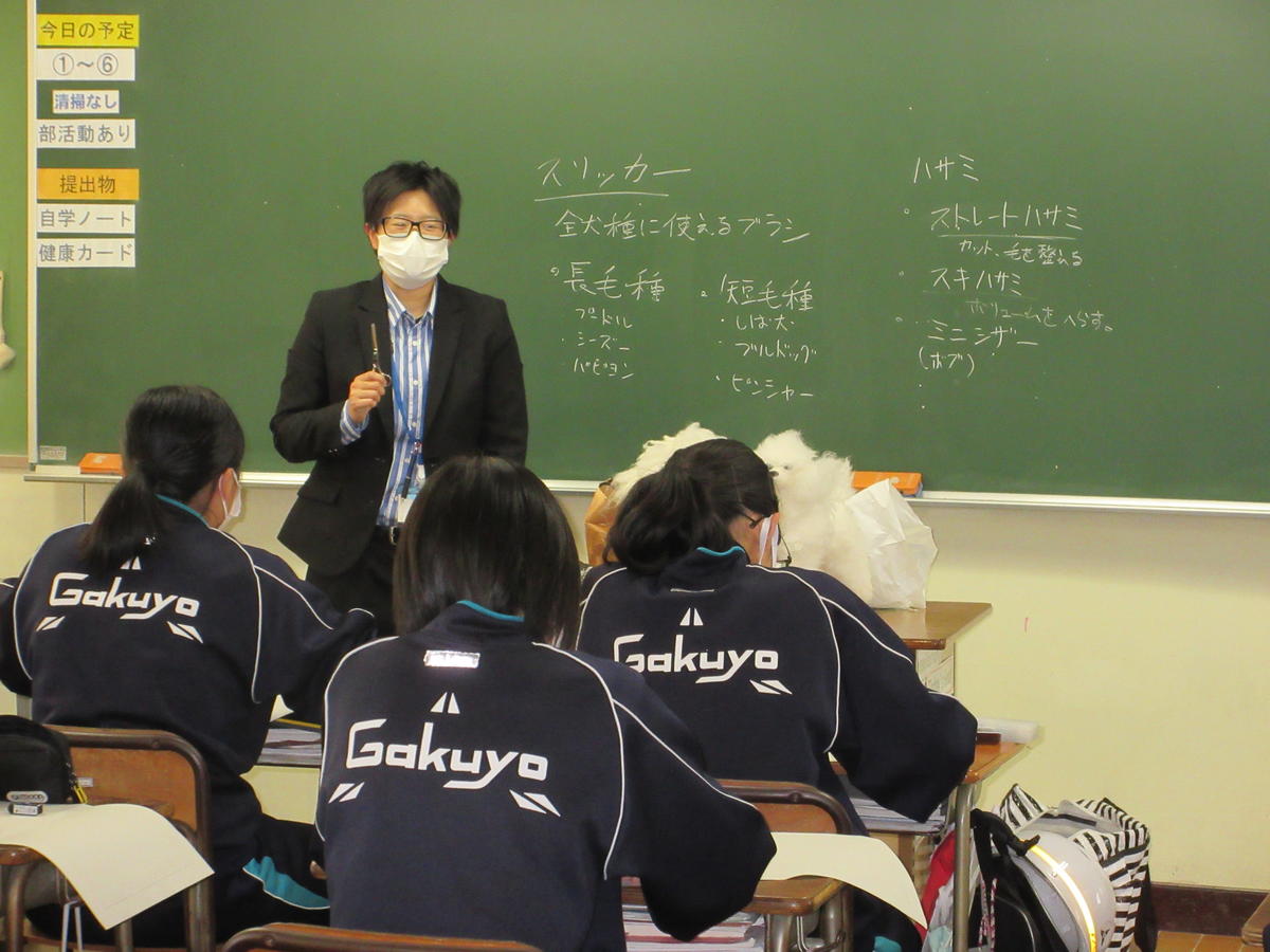 2年総合的な学習で出前講座が行われました。イラストレーター、美容師、トリマー、声優、保育園、パティシエ、理学療法、ファッションデザイナー、新聞社の9種類の職業を行っている方々を講師に招き、体験学習も行いました。大変意欲的に取り組みました。