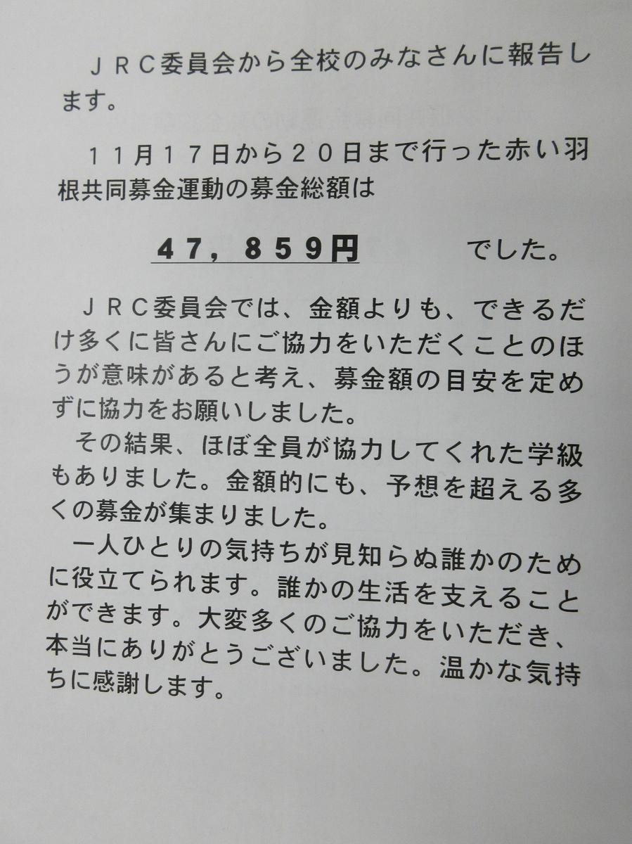 赤い羽根共同募金に47,859円集まりました。いつもは、「一人〇〇円以上」と決めて募金していましたが、今回は決めずに善意の募金として行いました。多くの生徒が募金の趣旨に賛同して、自分で金額を決めて募金したようです。集まった金額も素晴らしいですが、生徒達の気持ちはもっと素晴らしいと感じました。