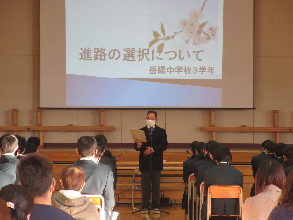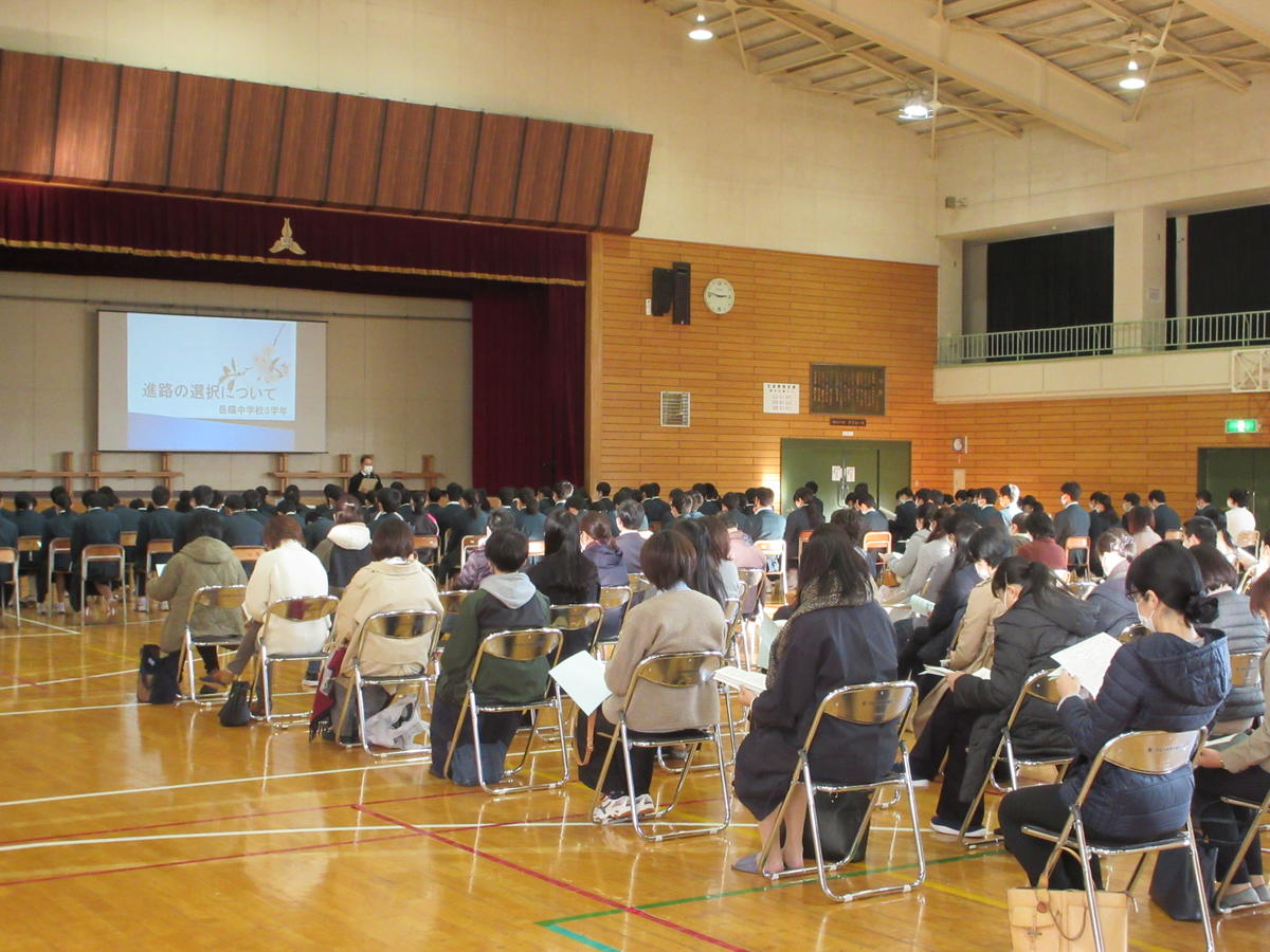 昨年度より、県立高校の入試制度が変わりました。令和3年度の福島県立高等学校及び私立高等学校の入学者選抜について、3学年生徒と保護者に対して説明会を実施しました。保護者の方々は、85名の参加でした。生徒も保護者の方々も真剣に進路指導主事の説明に耳を傾けていました。
