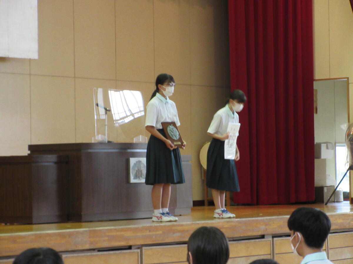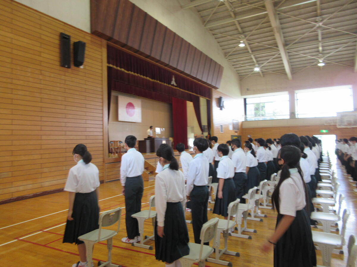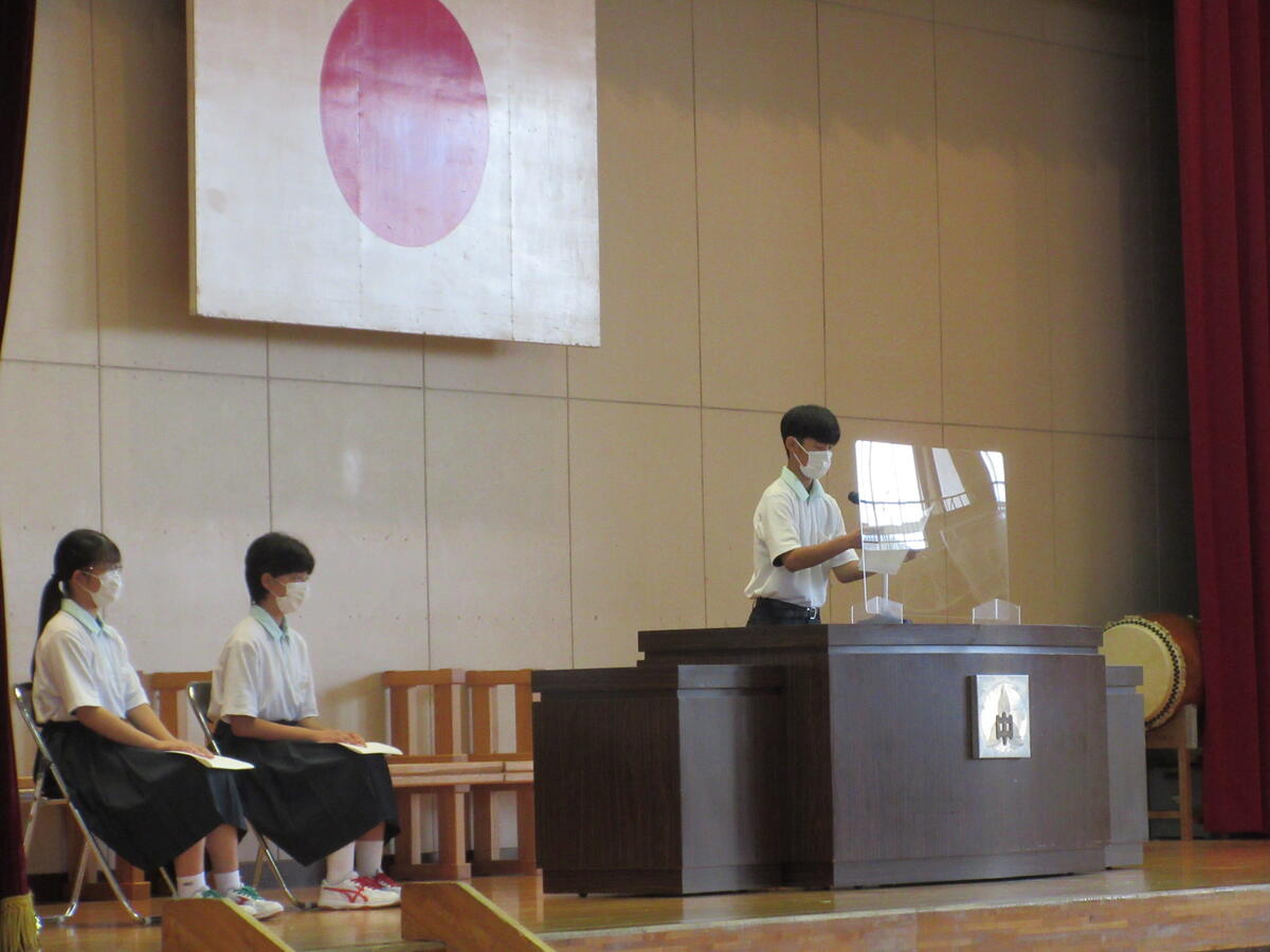 今年は、コロナ感染防止のための新しい生活様式の中での夏季休業となった。夏季休業中、全力で頑張れたことを自信につなげてほしい。何事も全力でやりきることの大切さに気づいてほしい。2学期は、季節の変化も大きく行事も多いが充実した2学期にしてほしい。各行事や受験に向けて、良い結果を求めて努力してほしい。毎日の生活の中で具体的な目標を持ち、楽しみを見つけながら向上心を持ってやり続けてほしい。夢や目標に向かって、生き生きと生活することを願っている。」とありました。その後、各学年の代表が今学期の抱負を発表しました。