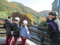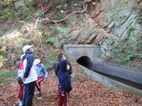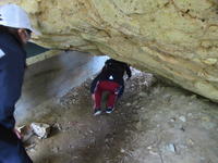 奥十綱橋下の上堰取入れ口では、身をかがめて岩をくぐり、岩の間に入って堰を見学しました。