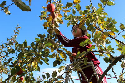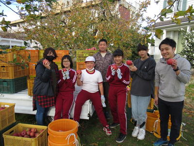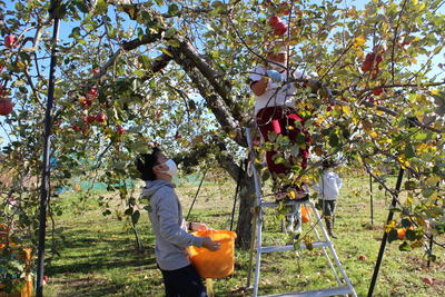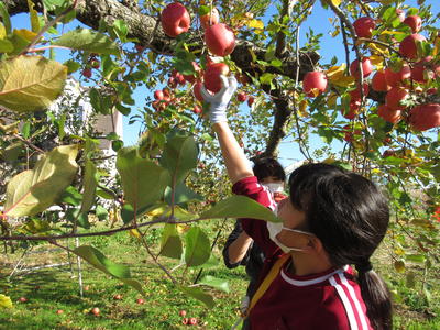 6年生が、リンゴ栽培でお世話になっている佐藤さんご夫妻にお手伝いいただき、リンゴ(フジ)の収穫をしました。
