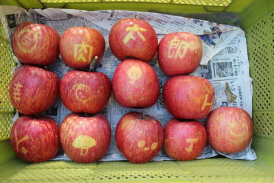 いくつかのリンゴには、赤くなる前に黒で絵や文字をかいたシールを貼っておきました。そのシールをはがすと、リンゴにかわいらしい表情が浮かびあがりました。