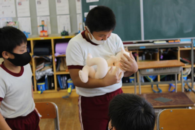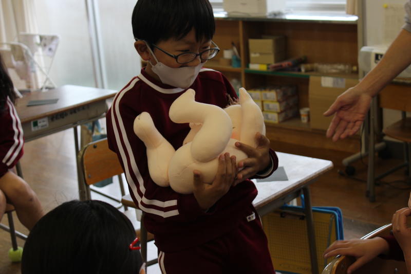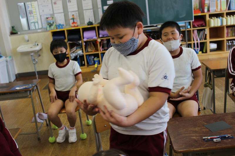 赤ちゃんが生まれるまでの経過を学んだあと、全員が赤ちゃん人形を抱っこしてみました。
