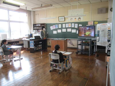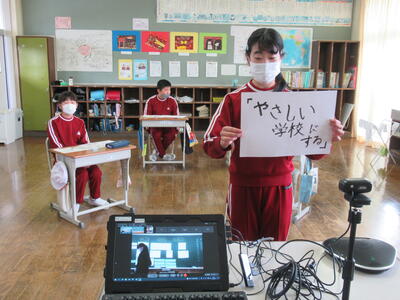 4月からの統合を控えて、湯野小学校の4年教室、5年教室をつないで、学級会を行いました。