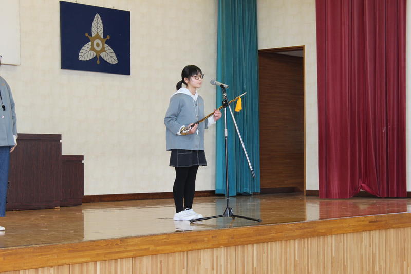 5年生の児童が「はい、頑張ります!」と元気に答え、指揮棒と楽器を引き継ぎました。