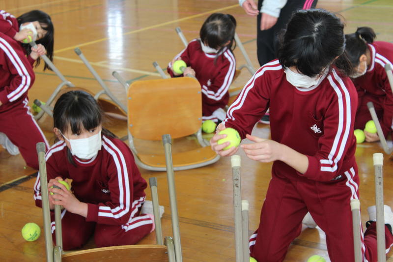 後半は、テニスが特技の用務員さんが作ってくれた机やイスの脚に付けていたテニスボールのカバーを新しくしました