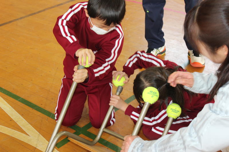 切れ目を入れたボールを付けるのはなかなか力が要る作業でしたが、高学年の子が低学年の子を手伝ってくれたりして、安全に取り付けることができました。