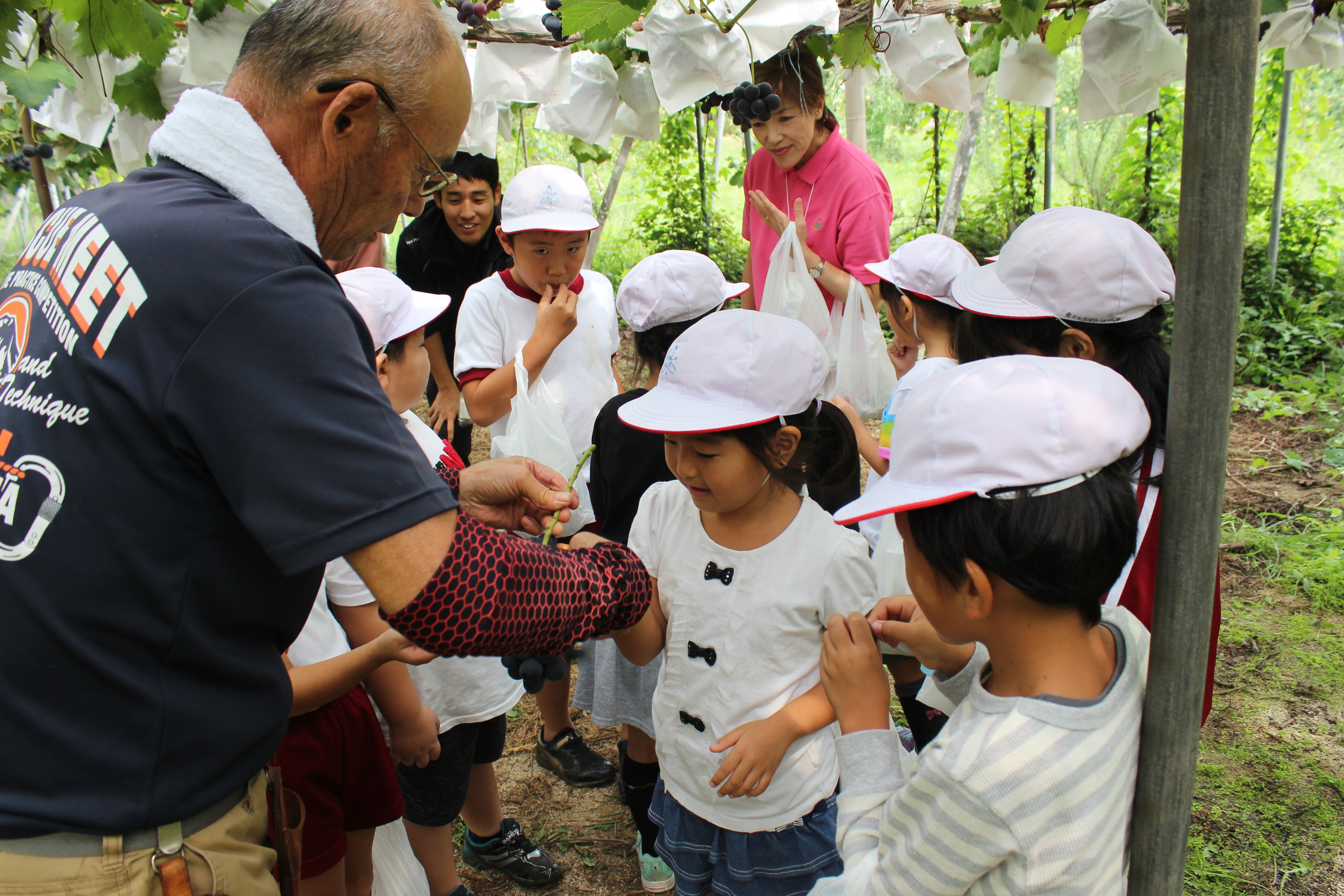 今年もぶどうが収穫の時期になり、1・2年生がぶどう収穫体験をさせていただきました。