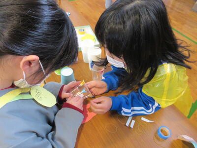 1・2年生が、湯野小学校の1・2年生と一緒に「おもちゃフェスティバル」を行いました。