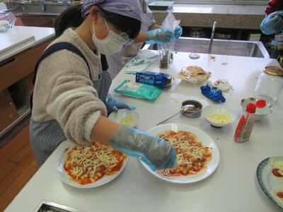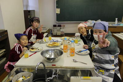 3年生は、ピザのトッピング。4・5年生は、果物を切ったり、ホットケーキを焼いたり・・