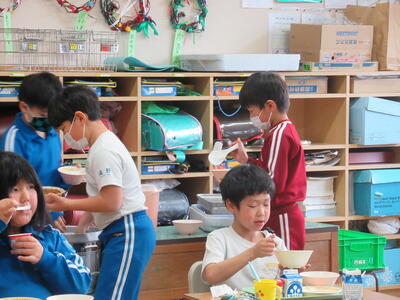 1・2・3年生が、湯野小学校の仲間と一緒に給食を食べ、その後お昼休みを過ごしました。