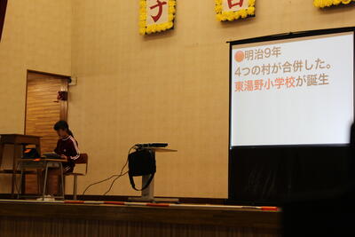 1・2年生は、これまでの学習を通して感じた「大好き!東湯野」の思いを発表しました。