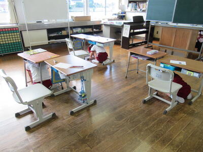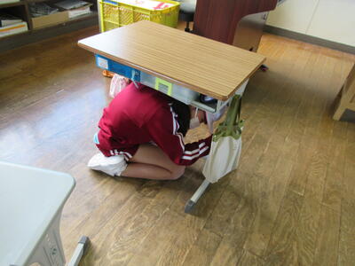 10時に、シェイクアウト訓練を知らせる放送が入り、各教室で安全確保の行動がとられました。どの学級でも、安全確保の行動がしっかりとられ、それを60秒間保持できました。