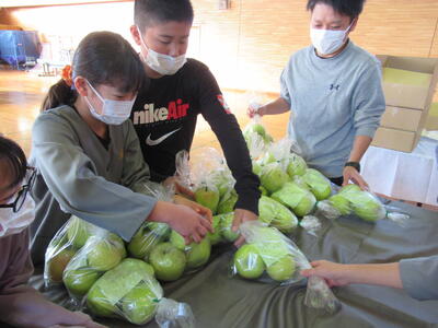 日用雑貨や地元産くだものなどの地域の皆様からの協賛品や、5年生が栽培体験に取り組んできたリンゴ(王林)、1~4年生が作ったポップを付けたお花などが売られました。