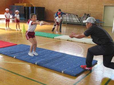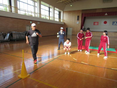 体育の授業に入っていただき、マット運動や高跳びについてアドバイスをいただいたり、模範を見せていただいたりしました。